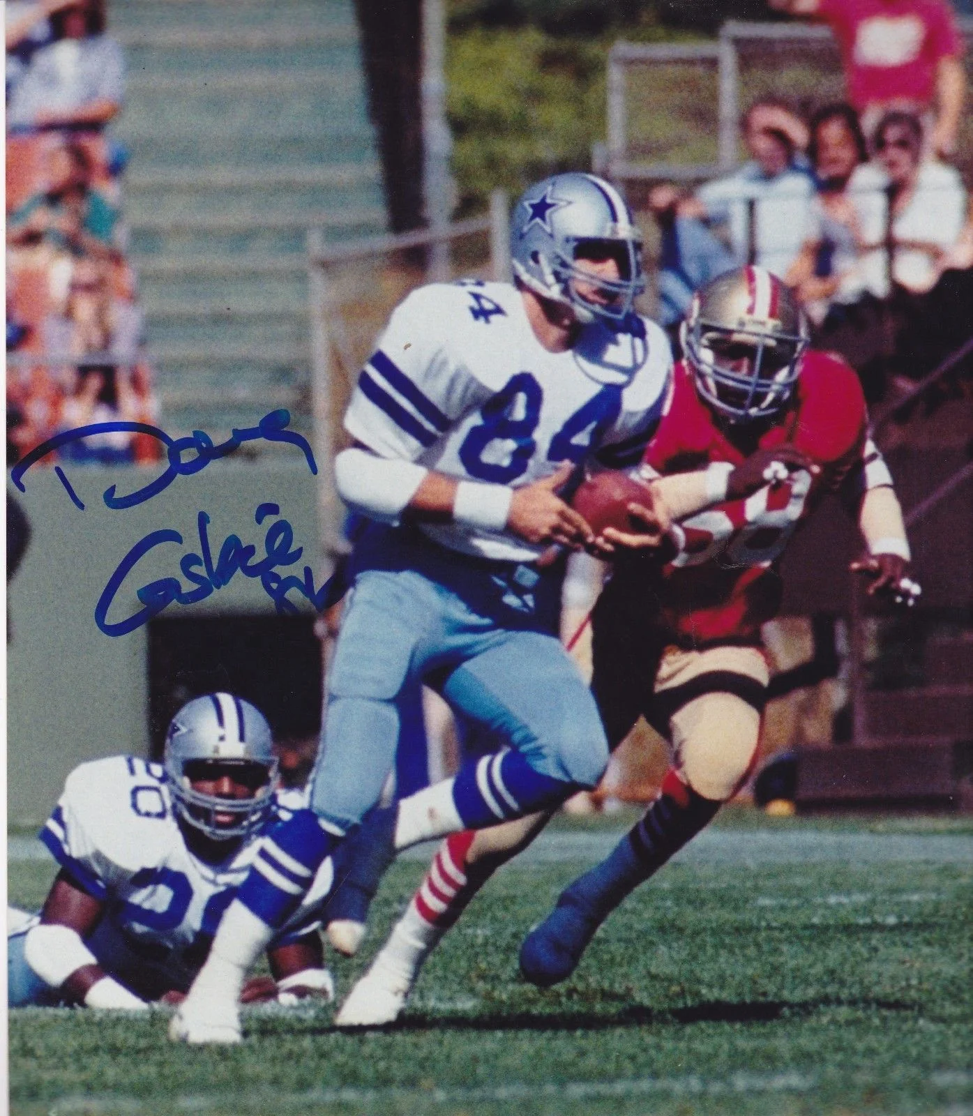 Doug Cosbie: I do. I was just talking about this the other day - during a Monday Night game in LA, someone had called in a death threat against Coach Laundry. For his protection, he left the sideline and came back with a bullet proof vest. No one knew what was going on until the plane ride home. Thinking about that situation, it was who Tom was, he was going to coach the game no matter what. Another favorite memory is, I had become friends with the actor, James Caan. He and his10-year-old son, Scott, would come to the games when we played the Rams. Scott was an athlete and big sports fan. Jimmy asked if I could get him a job on the sidelines. So, I spoke to our equipment manager and he had no problem with Scott working the game with him. He ended up being the guy who carries the head phone cable for Coach Landry. After the game was over, Scott and I are walking off the field, he said that he had fun and he really enjoyed it. I asked him if Coach Landry said anything to him, he said “yea, he said I did a great job”. I remember responding, damn he never told me that. That is something that Scott will always remember. I admit, I’m still a little jealous that Scott got a “good job” from Coach Landry!